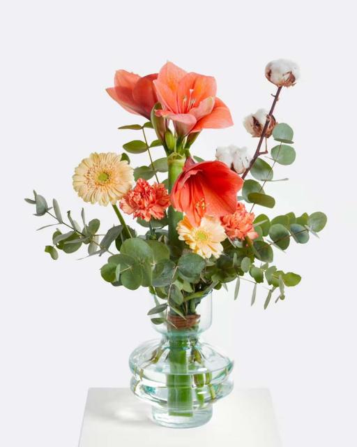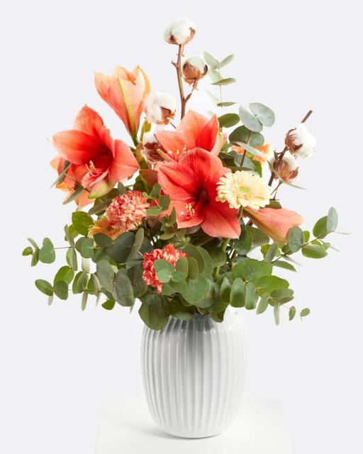 A téli kert ihlette gyönyörű karácsonyi csokor, mélypiros színű, lenyűgöző amarillisz virágokkal és friss zöld árnyalatokkal. Tökéletes ajándék téli születésnapokra. A virágüzlet becsomagolva szállítja a csokrot. A képen látható váza illusztráció és külön megvásárolható a rendelés folyamán.