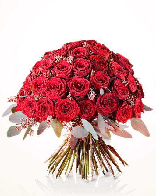 A vörös rózsa a szerelem és szépség ősi jelképe. A bámulatos "Szerelem" csokor tökéletesen kifejezi a legmélyebb érzelmeket. A levelek romantikus formája garantáltan mély benyomást kelt majd az ajándékozottban. A közepes csokor 50 szál rózsából, a nagy méret 100 szálból áll. A szár hossza 50-70 cm.